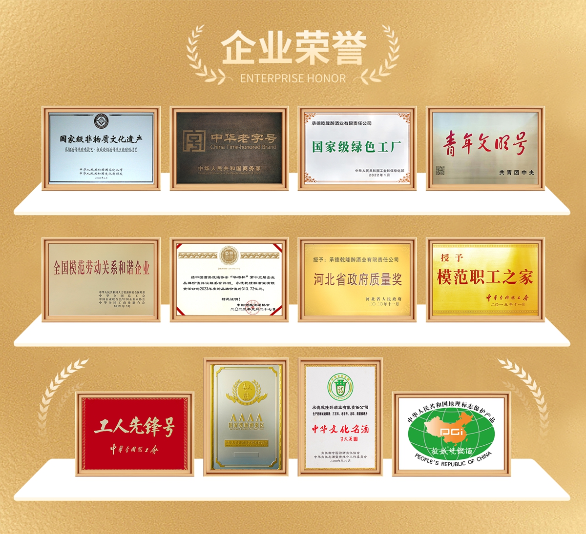 企業(yè)快速發(fā)展的同時(shí),也贏得了社會(huì)的廣泛贊譽(yù)。公司擁有國家專利8項(xiàng),注冊商標(biāo)124個(gè),先后榮獲“中華老字號(hào)”、“國家級(jí)非物質(zhì)文化遺產(chǎn)”、“國家地理標(biāo)志保護(hù)產(chǎn)品”、“國家級(jí)綠色工廠”、“中華文化名酒”、“全國模范職工之家”、“全國模范勞動(dòng)關(guān)系和諧企業(yè)”、“國家級(jí)青年文明號(hào)”、“全國工人先鋒號(hào)”“國家AAAA級(jí)景區(qū)”、“河北省政府質(zhì)量獎(jiǎng)”“第十五屆“華樽杯”板城品牌價(jià)值449.82億元”等上百項(xiàng)榮譽(yù)。
