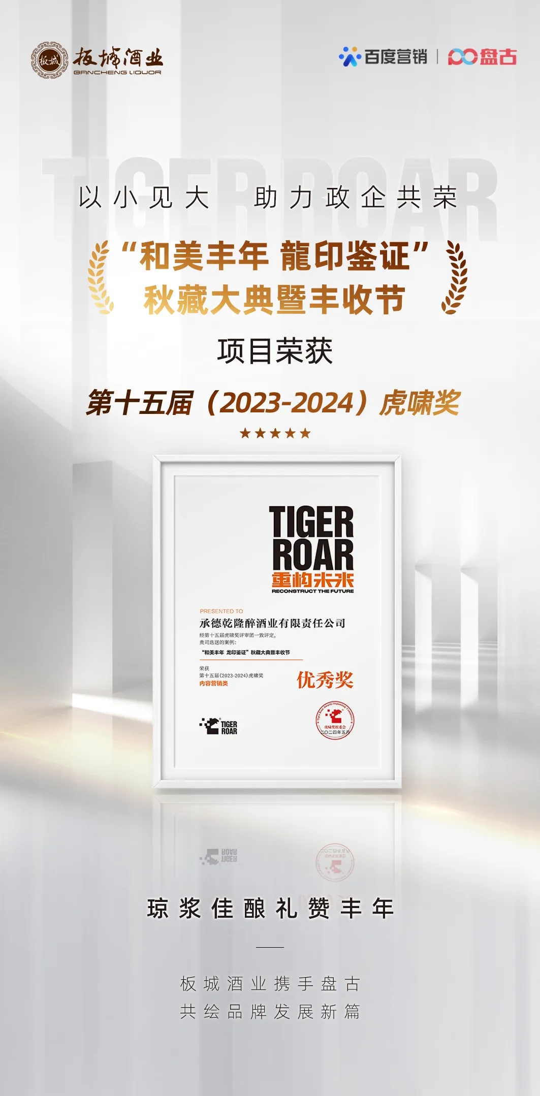 近日,第十五屆虎嘯獎頒獎典禮在上海舉辦,承德乾隆醉酒業(yè)有限責任公司憑借「“和美豐年龍印鑒證”秋藏大典暨豐收節(jié)」案例,以優(yōu)異的內(nèi)容營銷創(chuàng)意、資源整合能力及出色的營銷效果,從1020家優(yōu)秀企業(yè)提交的4505件參賽作品中脫穎而出,榮獲第十五屆(2023-2024)虎嘯獎內(nèi)容營銷類優(yōu)秀獎。